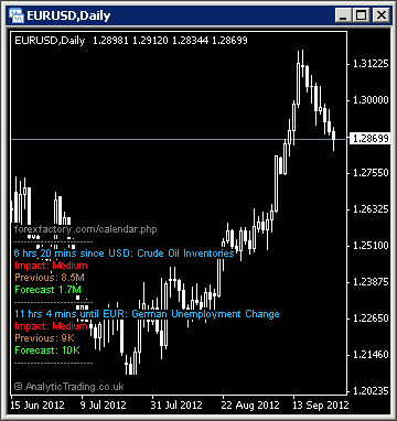 The Analytic Trading News Indicator for MetaTrader overlays up-coming and recent news events relevant to the instrument chart it is added to, with the optional display of all USD news events.
