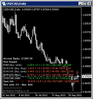 You set your risk tolerance per trade, and for your total open trades – this information will be used to continually feedback your open trade risk as chart information showing; the percentage of your account; the Risk:Reward ratio or R; trade points; and as money in your account currency – all as convenient text comment information on your chart.